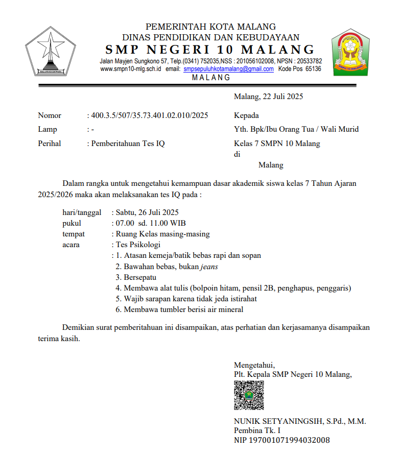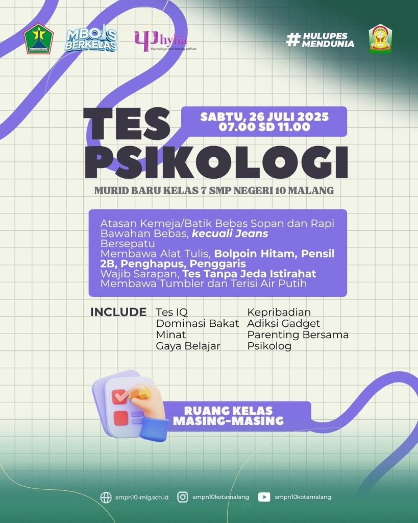PENGUMUMAN TES PSIKOLOGI MURID BARU KELAS 7 SMPN 10 MALANG